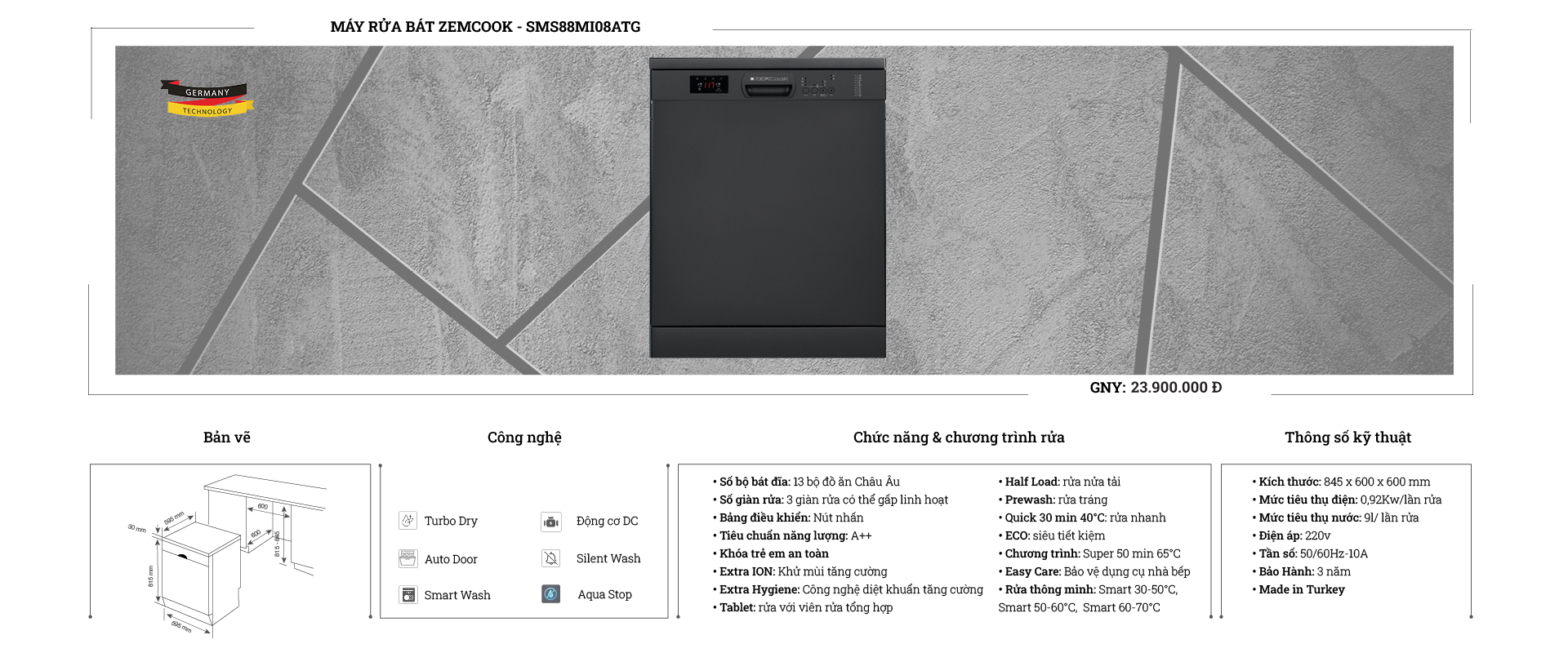 Máy rửa bát Zemcook được sản xuất và nhập khẩu nguyên chiếc từ Thổ Nhĩ Kỳ đảm bảo bền bỉ và an toàn khi sử dụng.